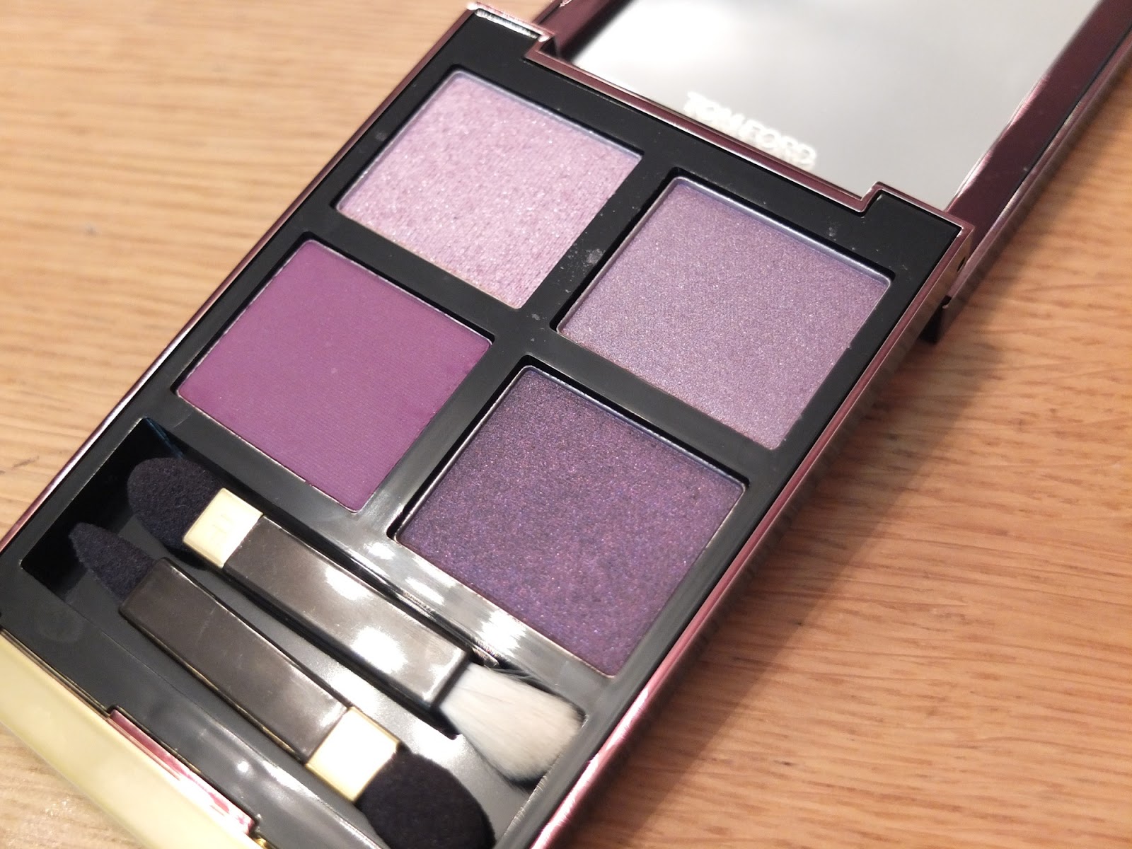黃燈下整盆都顯得更暖調,最下的打底色其實不太淺,可以給眼窩做成有深邃感。閃粉色就是很漂亮的粉紫閃,非常輕淡氣質。最喜歡的紫紅色,足以令人注目但不誇張,用來暈染在眼尾,非常迷人浪漫。最後的眼線色相對下較重,有神秘感,也加強大眼效果。
