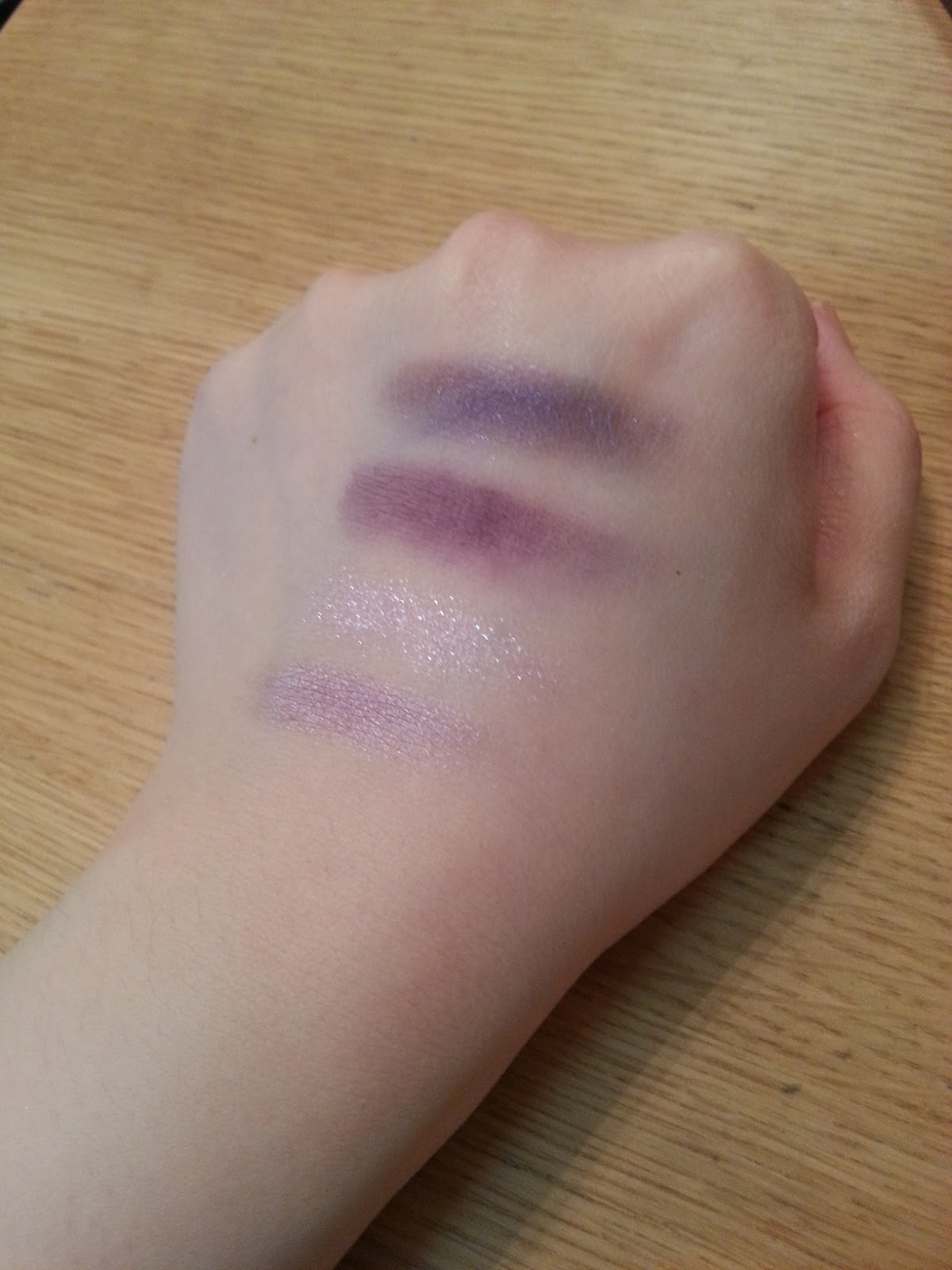 左上是閃粉色、右上是淺薰衣草打底色、左下是帶紅調較鮮的紫、右下是帶閃粉的深紫眼線色。